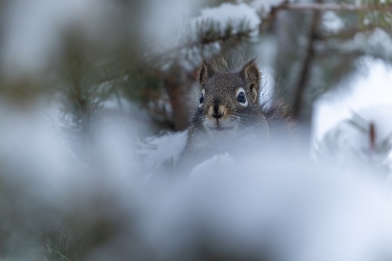 I was coming home for lunch and saw the squirrel that frequents the trees in the area. I saw it sitting in the tree and thought it looked too cute not to photograph. We were getting a good snowfall and I loved the effect it was giving the photos. I couldn't get enough of this little cutie.