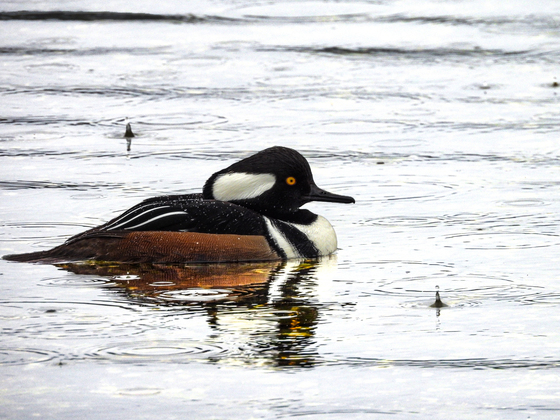 "Let it rain" is the mantra for this hooded merganser and myself as we both brave the soggy Vancouver Island winter weather. Drops of rain make ripples, splashes, and dimples in the water, creating golden abstract art of the merganser's reflection. It's a beautiful scene, one I felt compelled to capture.