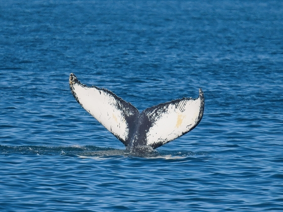 A humpback whale hunts along the St. Vincent's shoreline; Avalon Peninsula, Newfoundland. I loved the white coloured tail fluke.