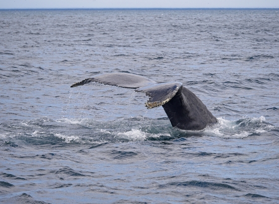 A humpback whale dives near Bay Bulls, Newfoundland. Judging from the condition of its tail this whale has been around for a while!