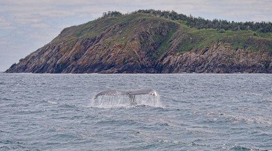 A humpback whale dives near Bay Bulls, Newfoundland. Judging from the condition of its tail this whale has been around for a while!