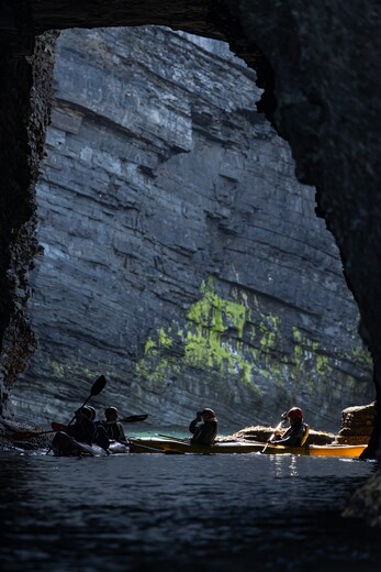 Paddling in the quiet of Bell Island's sea caves, these kayakers drift past walls steeped in mining history.