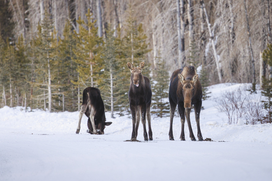 A mother moose guards her calves as curiosity and instinct unfold side by side in a fleeting moment of wild family life.
