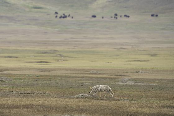 A coyote scanning the prairie dog colony with a herd of bison off in the distance