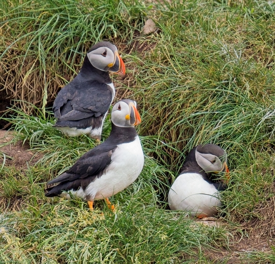 Atlantic puffins at the Witless Bay Ecological Reserve, Newfoundland. Puffins need enough soil to burrow into for their nesting sites so suitable sites in the rocky Newfoundland landscape are valuable puffin real estate.