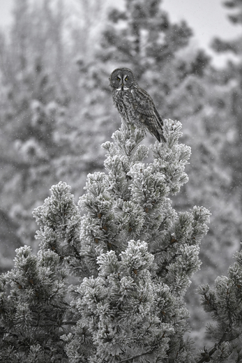 Severe weather hit areas surrounding Cochrane, Alberta at the beginning of February, blanketing the trees in frost. As the snow began to fall, I quickly left the comfort of home to brave the weather in search of a great grey owl. Thankfully, I found one briefly—just long enough to photograph. The muted tones strip the scene almost to black and white, leaving the owl perfectly at home in the heart of winter. Captured: February 1, 2025