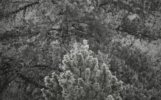 Hidden among the ice-coated trees, a great grey owl waits—so well camouflaged that it takes a moment to find. The scene asks the viewer to slow down, to look closer, and to discover the quiet presence of life within the stillness of winter. Captured: February 1, 2025