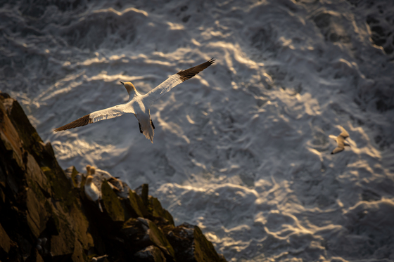 Viewing Northern Gannets from the cliff's edge above gives an aerial perspective of how this gracious giant masters both gale force winds and raging seas below along the rugged coast.