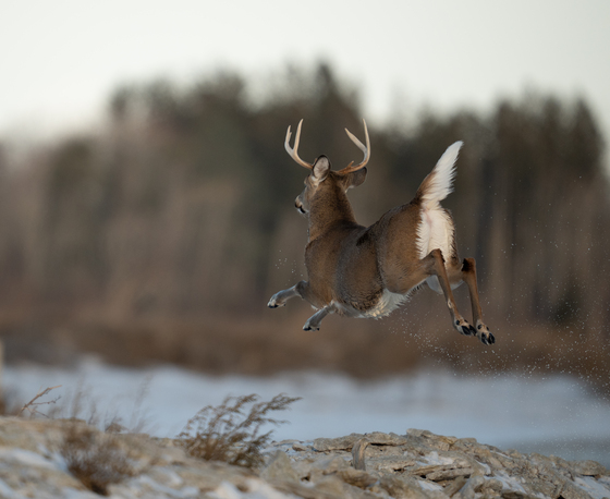While sitting and watching a snowy owl on Gull Island in Presqu'ile Provincial Park, a white-tailed buck trotted past me down the beach toward the mainland. I don't think it saw me until I moved, and then it began to sprint. I captured the buck in mid air as it ran past me. You can see water droplets coming off it.