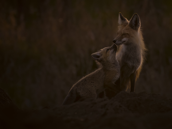 A family of foxes was denning in a construction area. Mounds of dirt were everywhere, and in the evening, the mother would sit watch on the pile,s and a kit or two would occasionally join her