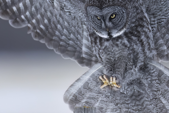 Out watching this great gray owl hunting on a winter day, the owl came in for a landing close by where I was watching. It was intent on its landing spot, feet stretched ready to grab the fence post with its talons