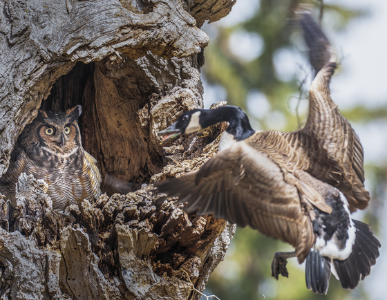 This high-action wildlife photograph captures a dramatic confrontation between a Great Horned Owl and a Canada Goose. Nestled deep within the hollow of an ancient, weathered tree, the owl peers out with wide, startled eyes as the goose flies in aggressively, beak open and wings spread wide in a defensive or territorial display. The image highlights a fascinating struggle for nesting space, as Canada Geese are known to occasionally attempt to take over nests or hollows used by raptors. The sharp contrast between the owl's static, wide-eyed vigilance and the goose's dynamic, blurred motion creates a sense of immediate tension. The rugged texture of the bark and the soft, natural light emphasize the raw reality of survival in the wild.