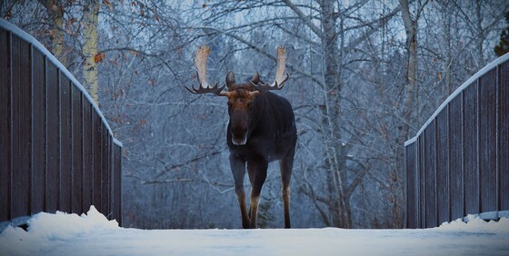 I was very fortunate to see two bull moose cross this bridge this morning, after a young bull wanted to cross thin ice. He got it figured out and turned around. The young one crossed first, the larger bull was second.