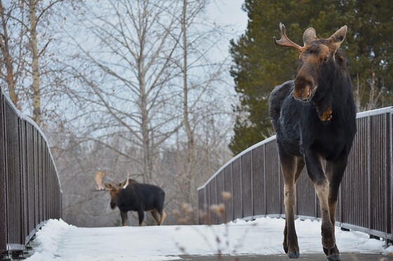 A young bull moose that initially tried to cross a frozen body of water found out it wasn't quite thick enough, so he came up the bank and used the bridge. I got photos of him crossing, but I was really excited to see the big bull come across.