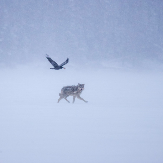 Raven and Wolf each with a piece of meat from a kill site on the frozen lake, headed to the shelter of the forest during a blizzard.