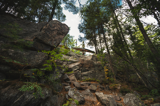 At the summit of the infamous Golden Staircase portage in Temagami, Ontario’s backcountry, along traditional canoe routes that form some of the oldest known, still-intact water trail systems in the world.