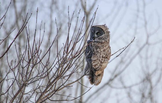 It was a very cold N wind and once this Great Gray Owl finally landed on the tiniest of branches, it looked like it as just wrapped up in those feathers as the wind tried to blow it off the branch (more like a twig)
