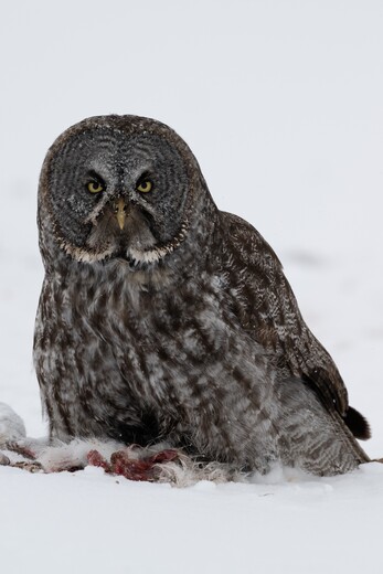 A Great grey owl and its Snowshoe hare dinner. Reluctant to fly away, even as I got closer to it, this owl's stubbornness to abandon its meal ultimately cost it its life as later that night a larger predator discovered it in its vulnerable situation.