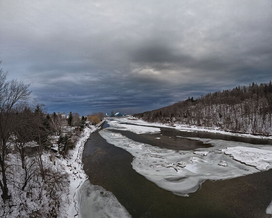 Two days of thaw and the Maitland River started to open up. The next big storm and weather maker can be seen crossing Lake Huron.
