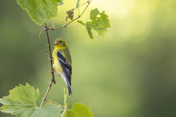 This American Goldfinch landed on a riverside grape vine and looked back at me as I hiked along the river trail.
