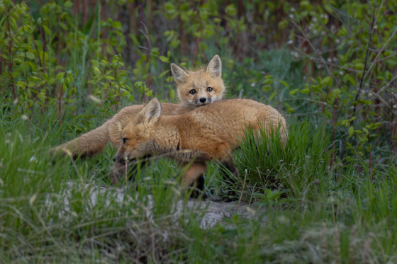 An image of two red fox kits near Waterton, AB
