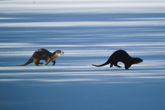 In the shafts of winter light a river otter chases its shadow across a frozen pond.