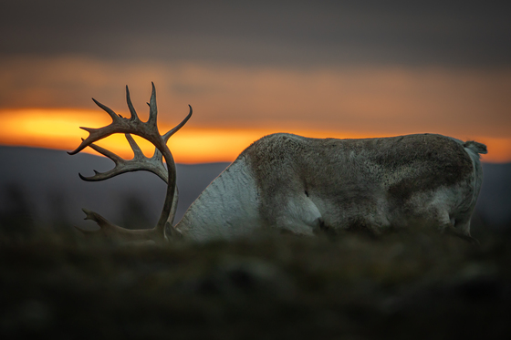 As I lay on the barrens a large bull Caribou grazes as its large antlers pierce the richly colored morning clouds preluding the coastal sunrise.