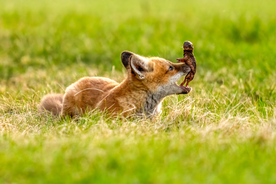 This image captures a fleeting moment in the early life of a red fox kit, where play and instinct briefly converge. The cub tosses its yet-to-be-understood prey gently, which happens to rest perfectly on its open mouth—not out of hunger, but curiosity and exploration, rehearsing the skills it will need to survive. Its movements carry the lightness and innocence of youth, yet hint at the rhythm of the wild. Photographed from a respectful distance, the scene reveals the delicate balance between innocence and instinct. In this brief instant, before play gives way to purpose, tenderness and survival intertwine, and the quiet rhythm of nature is revealed.