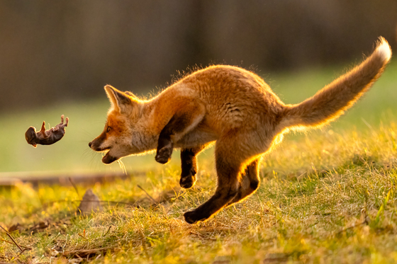 A red fox kit leaps toward its yet-to-be-understood prey, which hovers midair just ahead—not out of hunger, but curiosity and exploration, rehearsing skills needed to survive. Its movements are light, playful, and full of youthful energy, yet hint at the rhythm of the wild. Photographed from a respectful distance, this fleeting moment captures the delicate balance between innocence and instinct before play gives way to purpose.