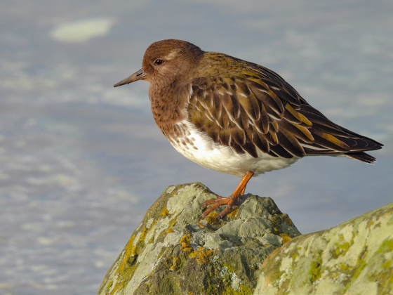 Feathers painted bronze by the midday sun, a black turnstone stands statuesque, quietly observing its surroundings as it basks in the much-welcomed December golden rays on a Vancouver Island shoreline.