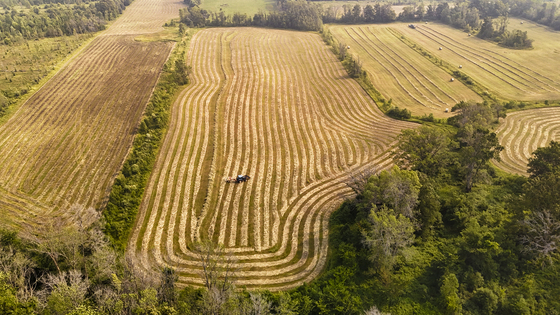 Windrow patterns in an autumn hay field. Getting ready for winter.
