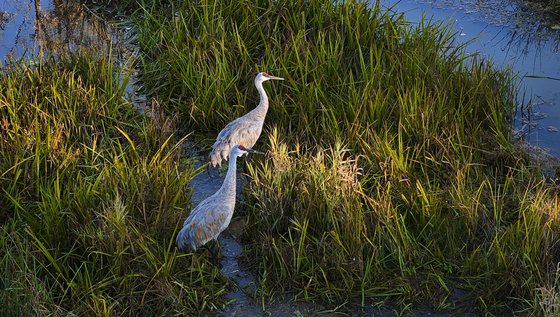Two sandhill cranes greet the sunrise in a beaver pond marsh.