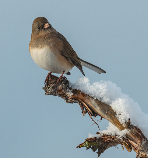 A female Dark-eyed Junco strikes a curious pose in my backyard.