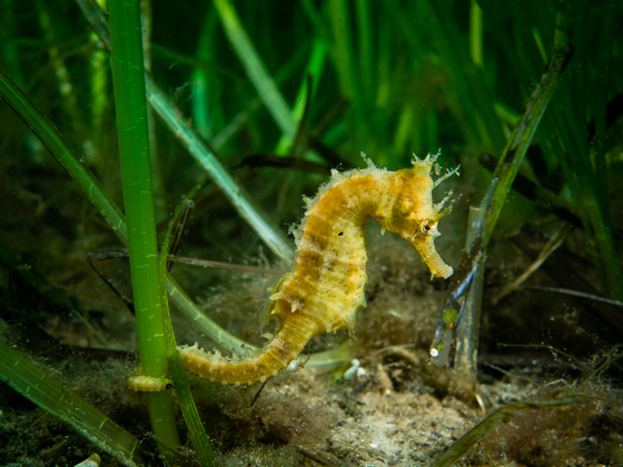 Hurricanes push volumes of sea water up the coast from the tropics. In the late summer and early fall, tropical visitors are transported to the shores of Nova Scotia. I've been trying to see a sea horse in Canada for a few years but was always too early. This year I delayed my trip for a month. A sea horse was spotted at a site after I arrived. They are usually found in eelgrass in shallow water. I spent 90 minutes of my dive looking methodically through the patches of eelgrass before I found this one.