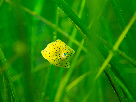 Hurricanes push volumes of sea water up the coast from the tropics. In the late summer and early fall, tropical visitors are transported to the shores of Nova Scotia. While I was diving, I spotted a yellow blob the size of a quarter moving around in the eelgrass. I didn't know what I saw but stuck around with it getting as many shots as possible. After some deliberations with local biologists and some tropical experts, it was determined that this is a juvenile Honeycomb Cowfish and is recognized as the first sighting in Canadian Waters.