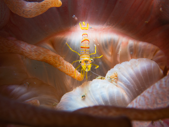 Candystripe shrimp are rarely seen in Howe Sound. They tend to use crimson anemones as a host for defense, but have been seen with other anemones. I located on crimson anemone host far from shore and have visited it a few times. They tend to stick around for months or years with the same host.