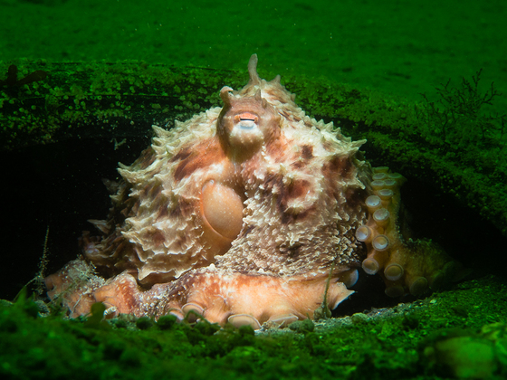 I was out on a long dive at Whytecliff Park, which used to act as a marina until a few decades ago. The bottom is still littered with cables and tires. Marine life repurpose the refuse into homes. This giant pacific octopus was posed in the middle of a tire. I lit it up with snoot lighting while leaving the background emerald.
