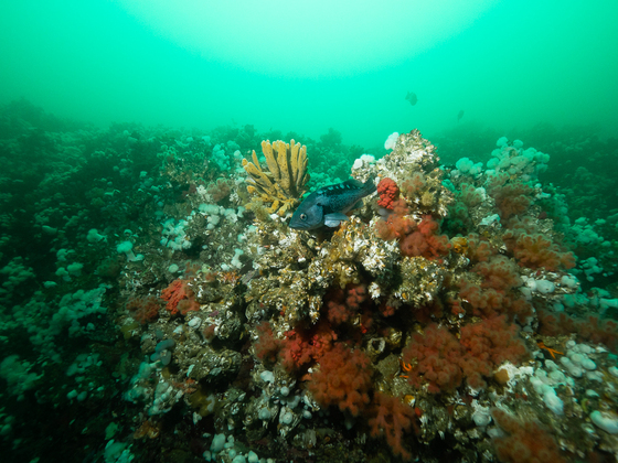 God's Pocket Marine Park has some of the best cold water diving in the world due to the rich ocean currents feeding through narrow channels. The water can be a peculiar blue/green due to the exchanges from the open ocean. This supports an incredible amount of fecundity including sponges and soft corals. I caught a rockfish pausing amongst the landscape.