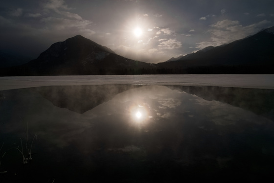 At sunrise, the mountains formed a dark silhouette, mirrored perfectly in a small unfrozen pocket of Vermilion Lake in Banff National Park.