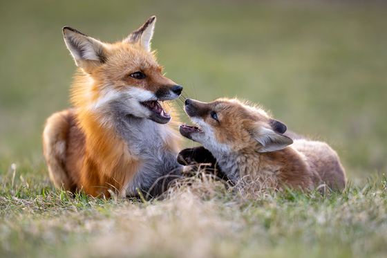 A red fox mom rests half-reclined, face to face with her cub slightly below. Their gently open mouths align as the cub gazes up with calm trust, capturing a tender moment of connection in the wild.