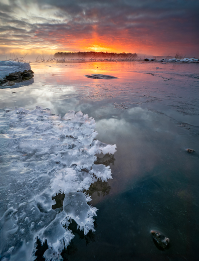 An early December sunrise illuminates an icy shoreline on Manitoulin Island.