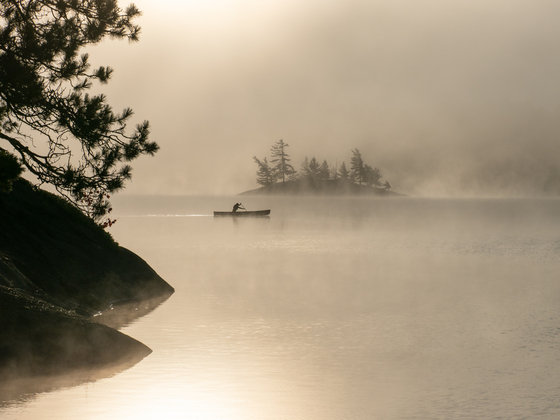 A misty morning paddle in Point Grondine Wilderness Park in northern Ontario.