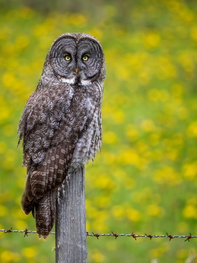 A great grey owl perches on an old fence post framed by a field of dandelions.