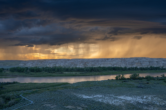 A spring thunderstorm passes through Dinosaur Provincial Park, Alberta at sunset.