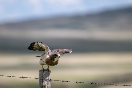 A Swainson's hawk preparing to takeoff from a fence line in southern Alberta.
