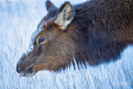A baby Elk sniffs out the ground covered in snow at Jasper
