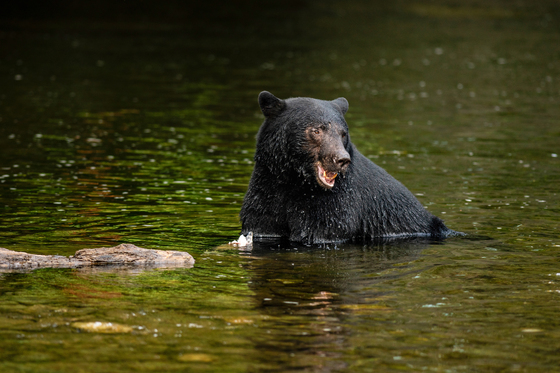 A black bear sits in the river, salmon between its paws, lips loose and teeth visible. Its gaze drifts upstream as water glints from its fur. The pause is momentary but alive, hinting at both play and attention in the midst of the river’s flow.