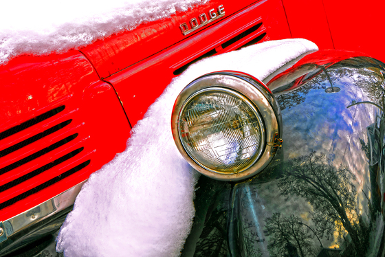 A rare Vancouver snow covered this old red truck that reflects the winter streetscape and post storm sky.