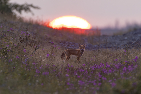 This image was taken on the way back to Yellowknife on the Tłı̨chǫ all-season road—a red fox in the setting sun.