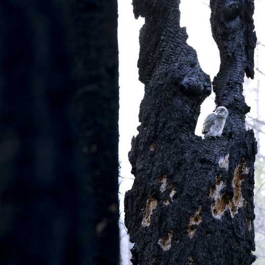A recently branched great grey owl fledgling perches above the bowl of its nest in unique, heavily burned tree. One of the dozens of surrounding burned trees "splits" the screen to deliver an interesting take on the natural blacks and whites in the environment.
